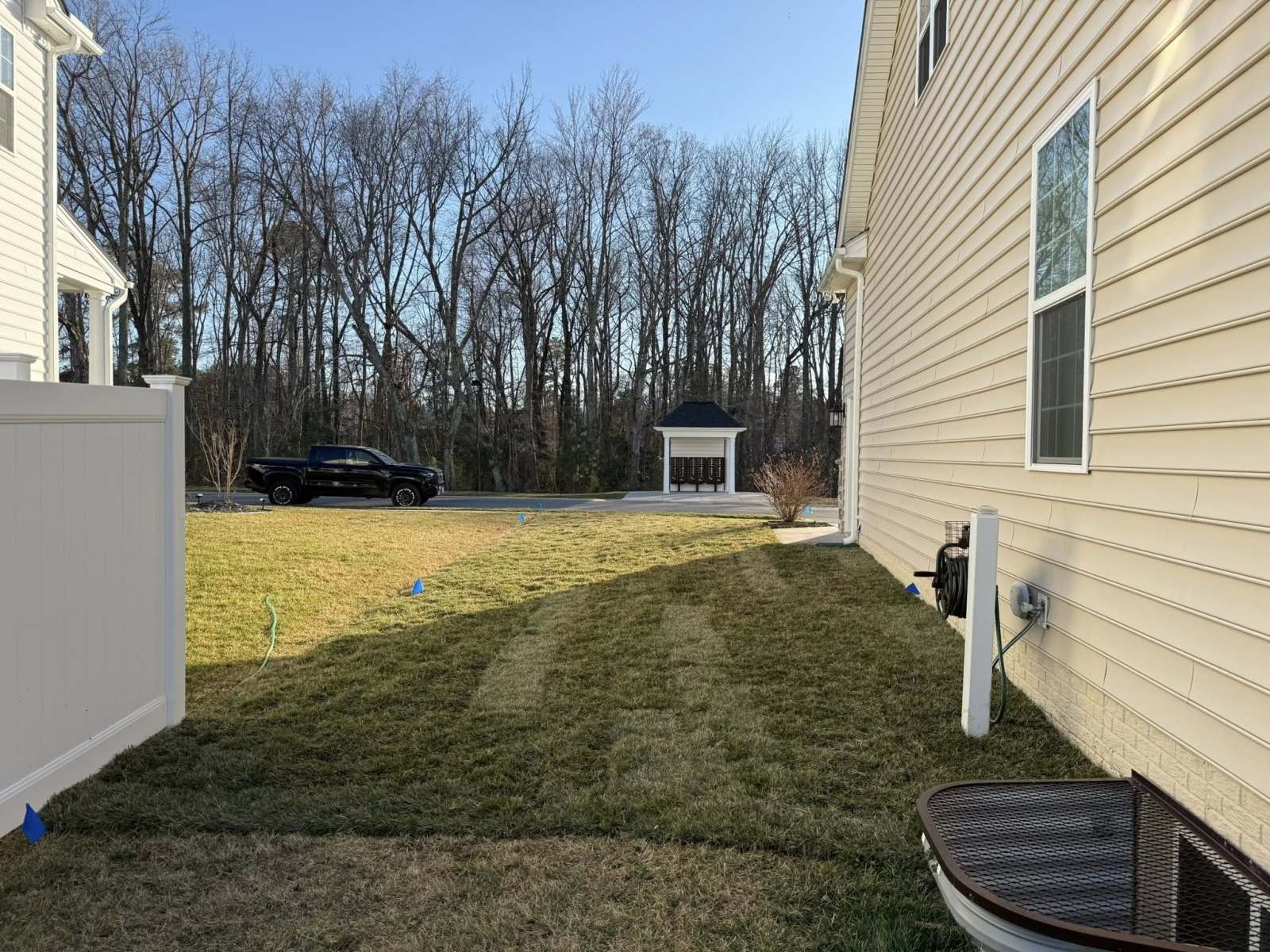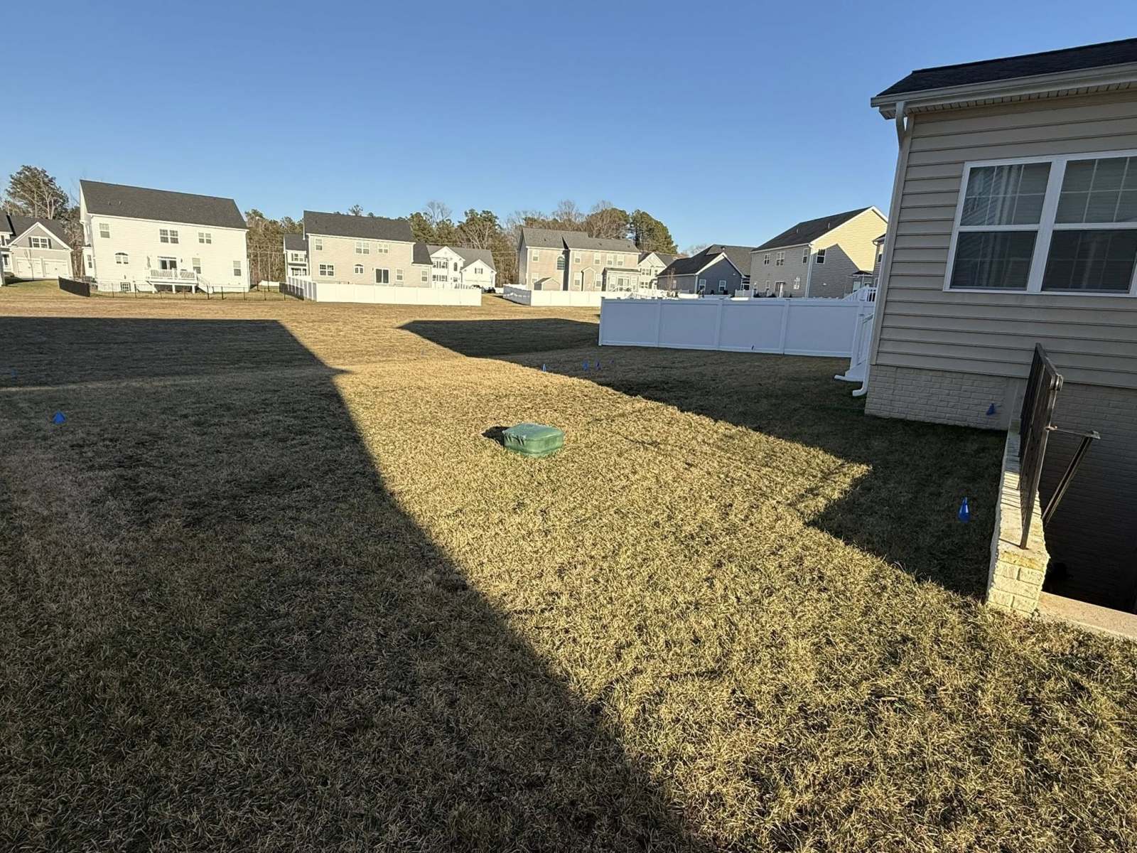 Landscape crew installed 3 green giants, hauled in and spread top soil to grade out lot, and layers new sod. New techo block stepping stones installed to give transition from home to greenhouse.