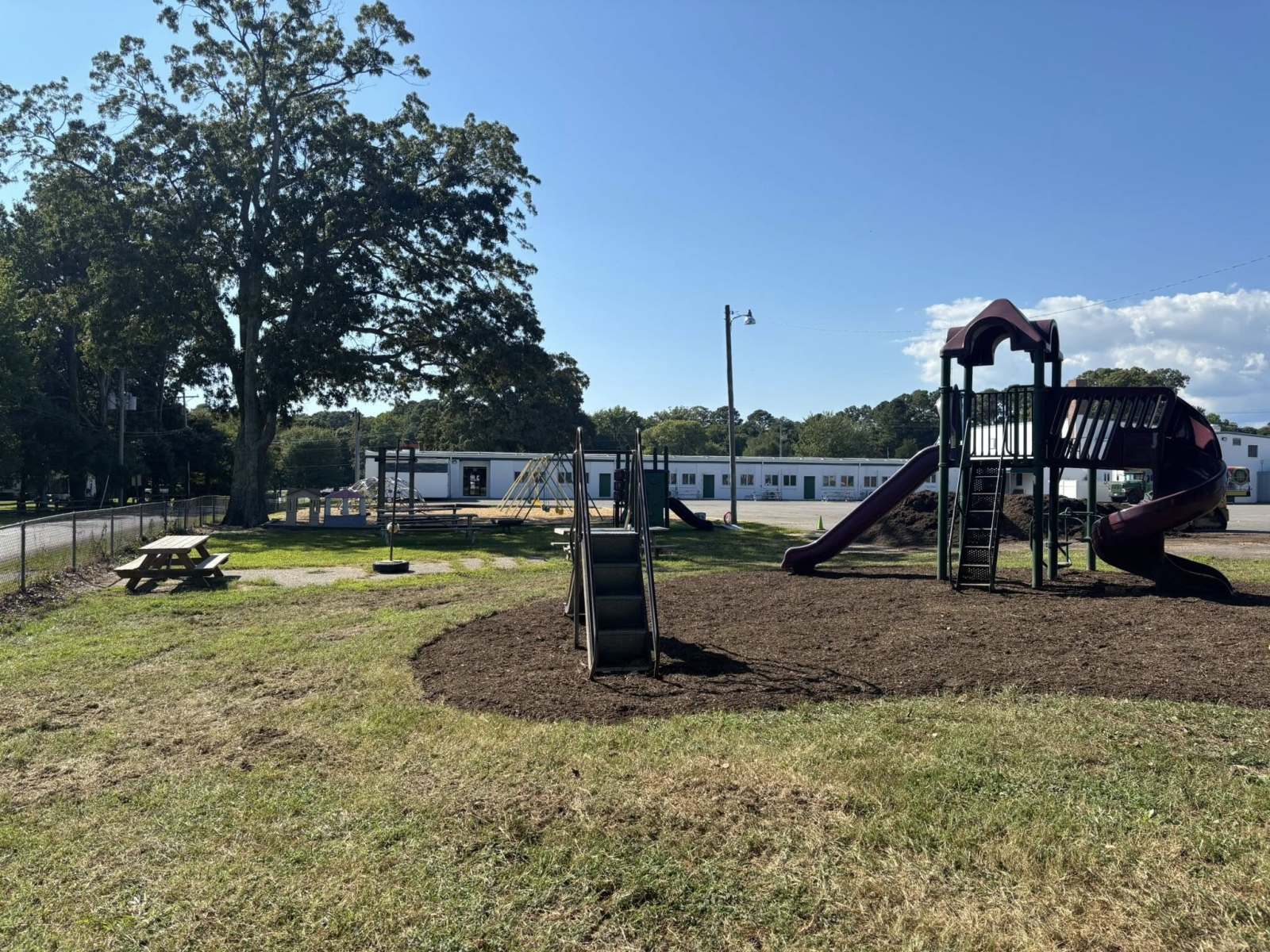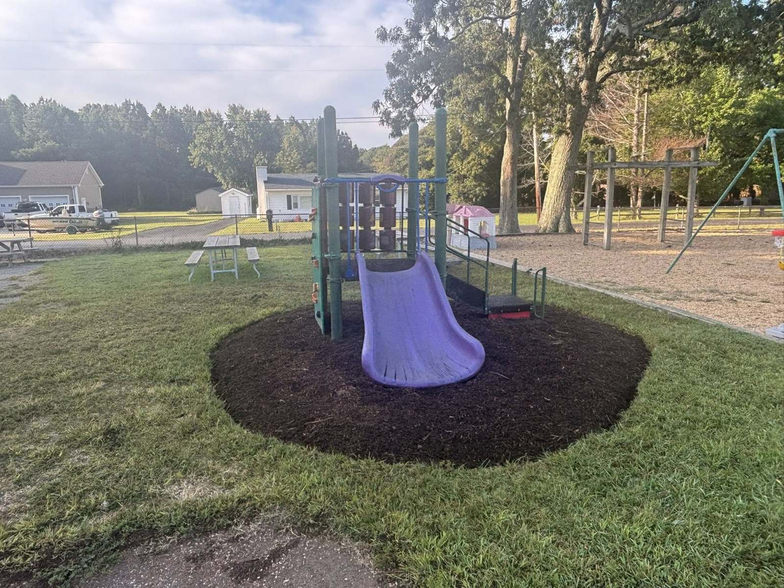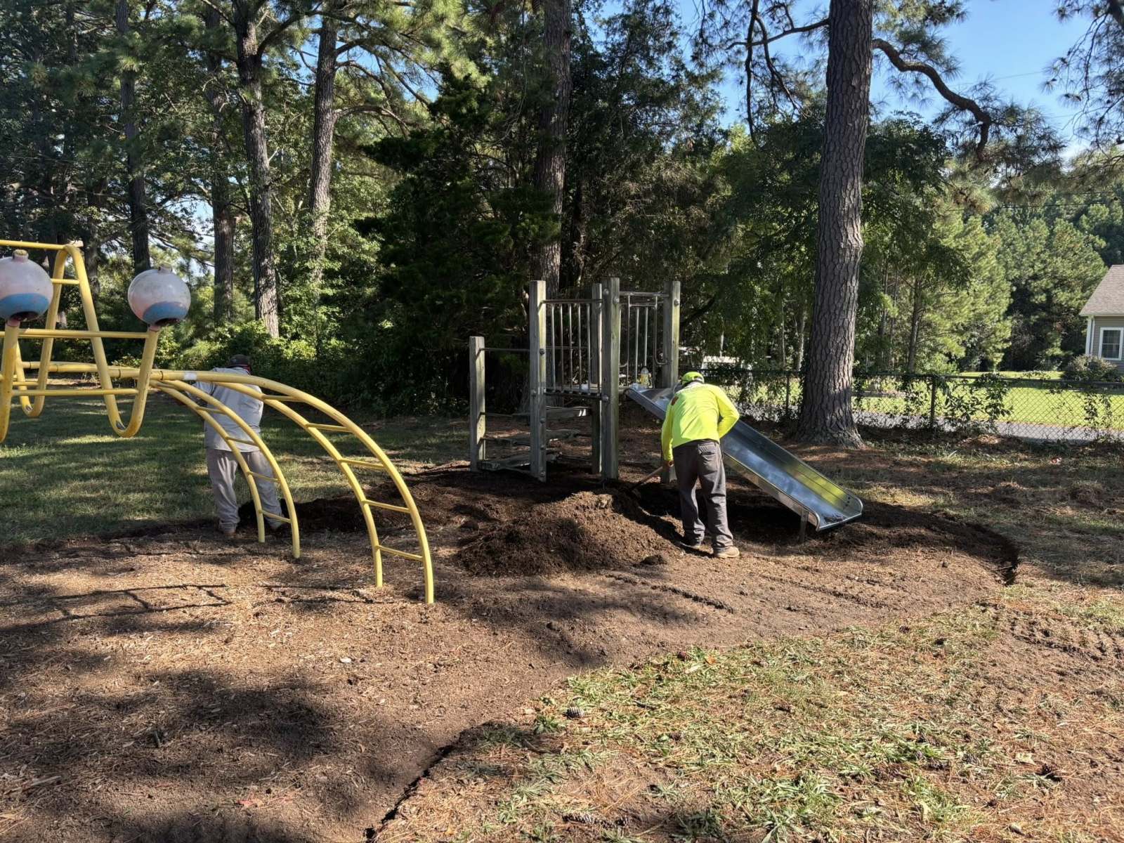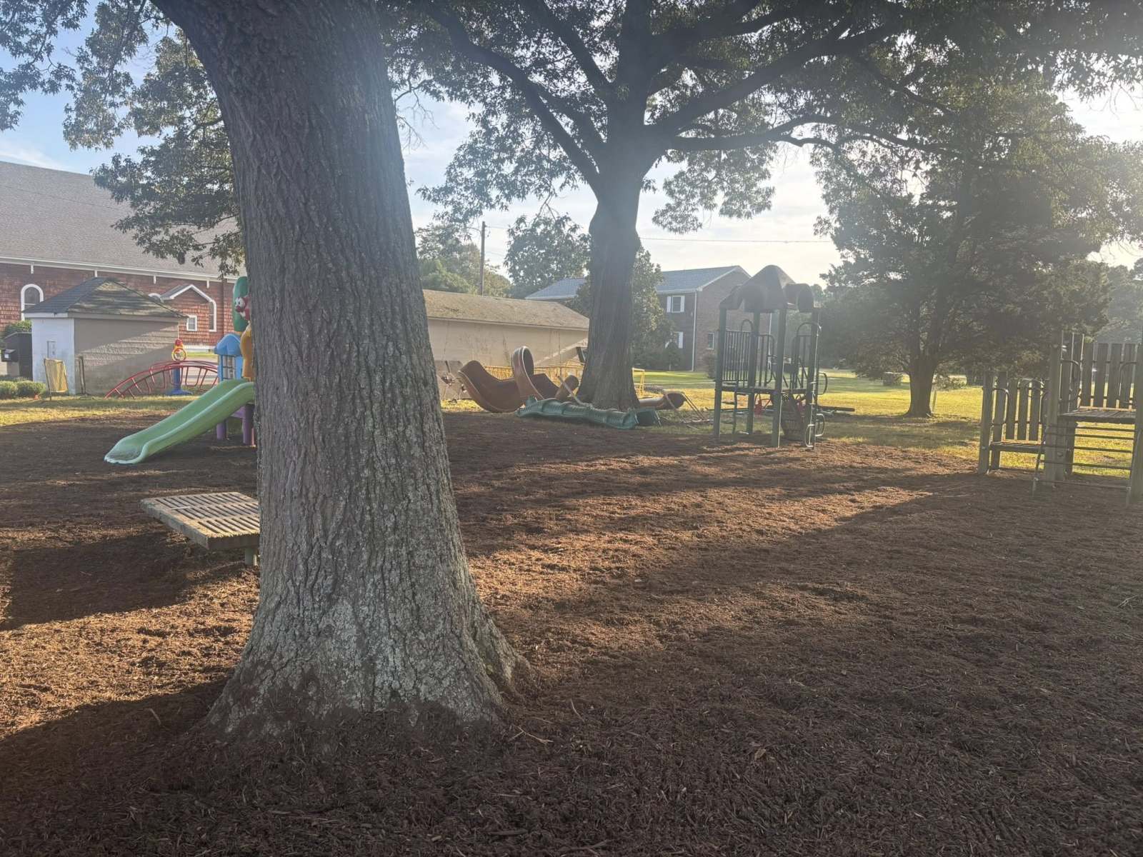 St Michaels got a huge upgrade to the playground areas yesterday. Crew prepped areas and installed 60 yards of shredded hardwood mulch as a buffer to keep the kiddos safe at recess.